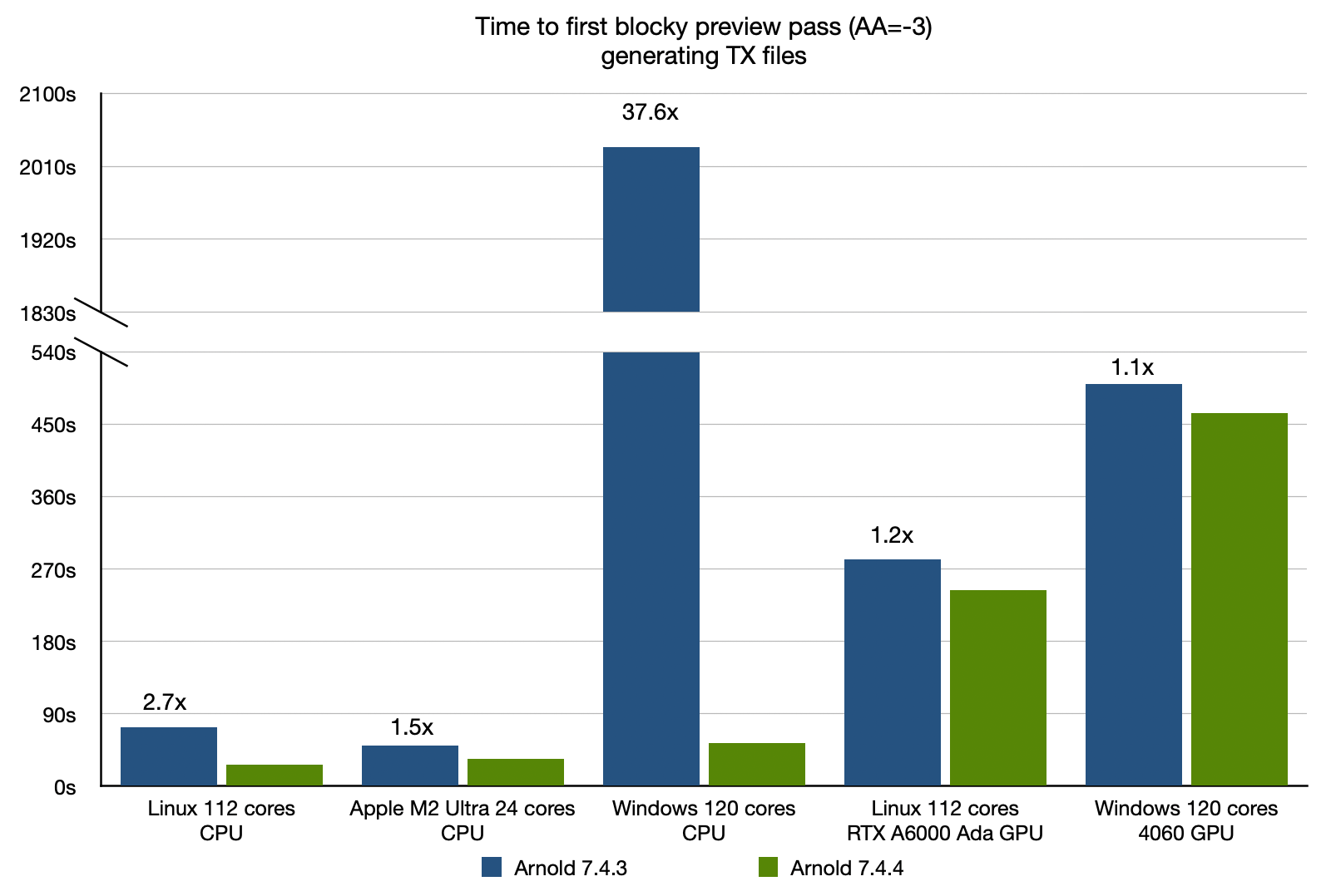 Checking for existing TX files and auto-generating missing ones is now significantly faster, reducing time to first pixel when using texture_use_existing_tx or texture_auto_generate_tx. As the charts below show, speedups are most pronounced on many-core machines, particularly on Windows. (ARNOLD-13116)