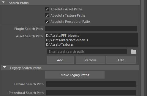 • New Asset Search Path editor: A new editor for a unified path for discovering assets such as textures and procedural source files (ASS, USD, ABC). Previous search paths are still supported but moved to a Legacy Search Paths section. (MTOA-2512)