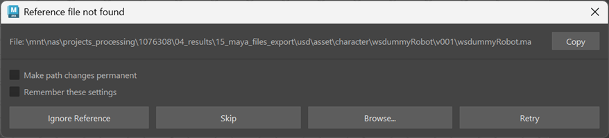Note: If Maya displays a warning that file references are broken, you can manually update the paths using the dialog that appears (for example, the character rig can typically be found in the usd > asset > character folder).
