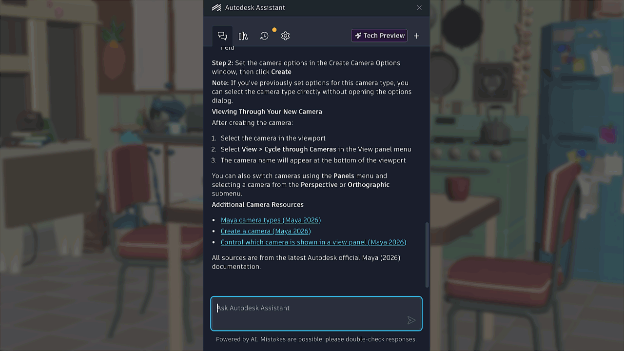 Ask questions about Maya functionality and receive clear guidance to help you learn and work faster.
