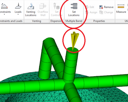 Sub barrels locations and sub barrel process settings are set from the Boundary Conditions tab. Each sub barrel must only be applied to only one node, but you can create upto 15 sub barrels and assign them to 15 different nodes. Sub barrel glyphs can be differentiated from the master barrel injection location by their shape.