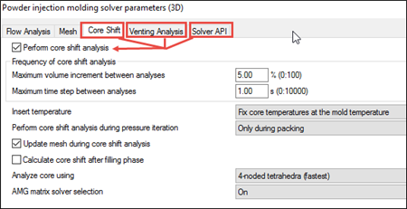 To access these features, ensure that you have selected Powder Injection molding as your molding process. Click (Home tab > Molding Process Setup panel > Process Settings). Click Advanced Options, then click Edit associated with Solver parameters.