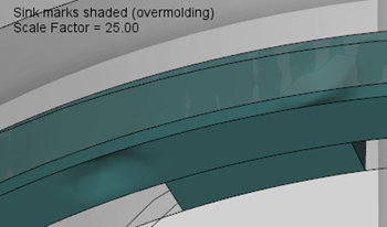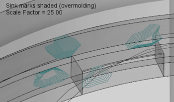 The Sink marks shaded (overmolding) result displays the sink marks in the part as lines and marks, more indicative of the actual appearance.