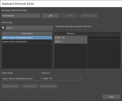 Setting the Interaction Mode to use mouse and keyboard shortcuts from other 3D applications while working in MotionBuilder enables you to seamlessly switch between those applications and MotionBuilder without having to learn a new set of keyboard shortcuts. See Interaction Mode.
