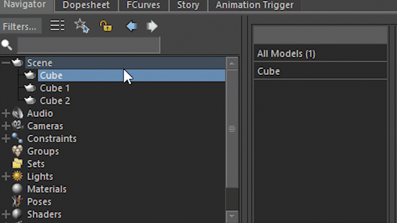 You can now reorder objects in the Navigator by dragging and dropping them onto other objects. When you drop an object, MotionBuilder prompts you to move it above or below the target.