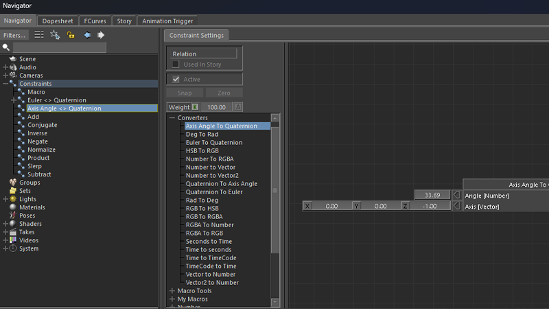 New quaternion boxes are now available in Relation constraints, giving you direct access to rotation math operations. These tools help you build rigs that require precise control over sub-joints or complex rotation blending.