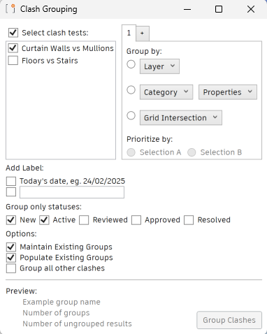 Note: Clash group names are generated based on the criteria selected, as well as any added labels.Group only statuses - Select which status clashes you want to group. For example, you may only want New and Active clashes to be grouped.