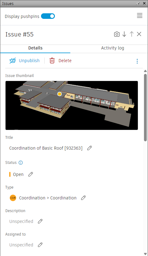 Tip: You can sort issues by status (Open to Closed, or Closed to Open), ID (ascending or descending), and due date (old to new, or new to old).Select or search for an issue on the panel, or click a pushpin on the model.