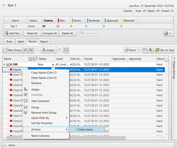 Right-click on your clash selection to display the context menu, and then select Actions > Create issues.