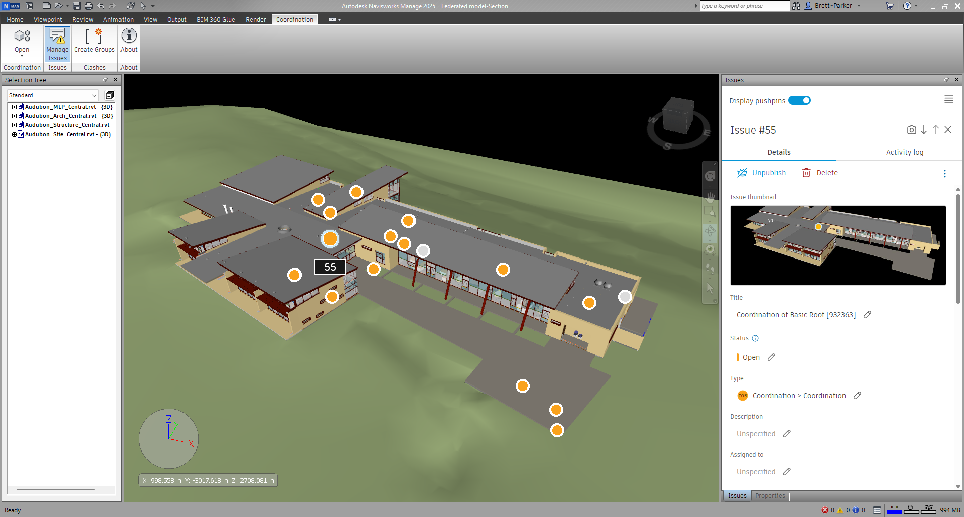 Tip: From the drop-down menu, click Refresh in the panel to load any changes to issue data, and sync between BIM 360 or Autodesk Docs, and Navisworks.Model courtesy of DesignGroup and the National Audubon Society