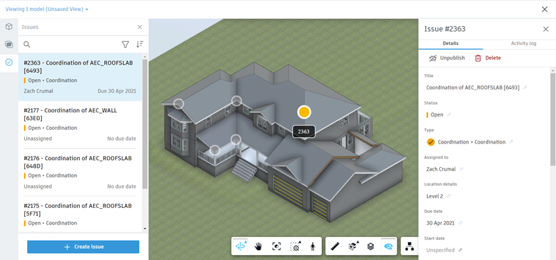 Issues are used by teams to identify and communicate areas of concern or improvement with a model. You can create an issue in Navisworks, or in Model Coordination (in BIM 360 or the Autodesk Construction Cloud platform), and synchronize the issue data between the two programs, to enable effective collaboration across your team.