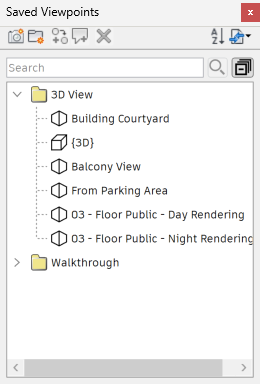 The Saved Viewpoints window is a dockable window that enables you to create and manage different views of your model so that you can jump to preset viewpoints without having to navigate each time to reach an item.