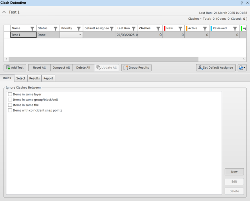The Clash Detective dockable window enables you to set up the rules and options for your clash tests, view the results, sort them, and produce clash reports.