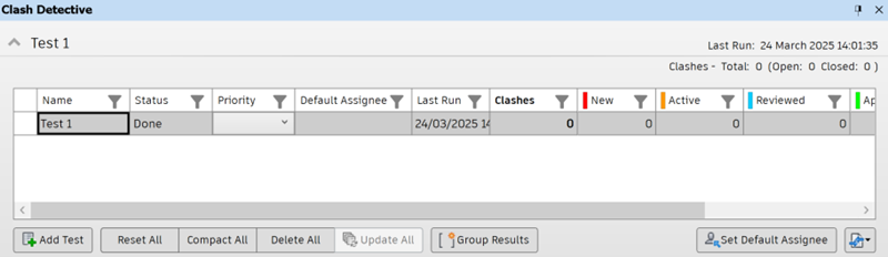The Tests expandable panel can be accessed from all tabs of the Clash Detective dockable window and displays summary information for each of the displayed clash tests. The total number of clashes in each test is displayed, with the number of clashes at each clash status identified.