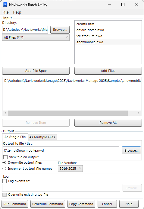 In the Navisworks Batch Utility dialog box, use the Input area to create a list of design files for conversion: