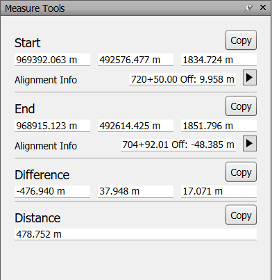 For all measurements, the X, Y, and Z coordinates of the Start point and End point are displayed in the text boxes, together with the Difference and the absolute Distance information. If you use accumulative measure, such as Point Line or Accumulate, Distance shows the accumulated distance for all points registered in the measurement.