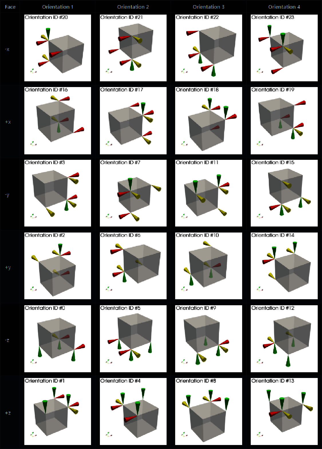 This card is used to automatically include boundary conditions. There are 6 × 4 = 24 supported options. These options are depicted in the figure below. The face ID is -1 to fix the -x face, -2 for -y, -3 for -z, 1 for +x, 2 for +y, or 3 for +z. The orientation ID represents 1 of 4 specific orientations on the face selected by i1.
