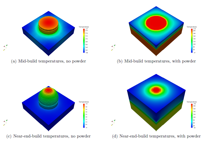 First look at the thermal results. Figure 2 shows the model temperature at different time steps for two different layer group simulations, with and without powder results.