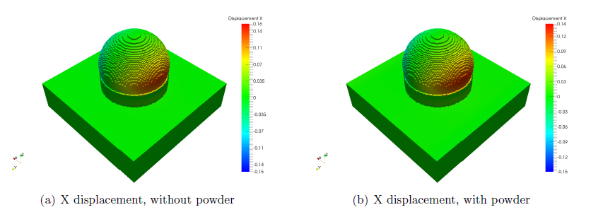 Neither of these simulations have excessive distortion. However, note that the simulation with powder distorts 12.5% less than the simulation without. This shows that the modeling of heat losses due to powder effects may have a large effect upon the both the predicted distortion and the validity of the simulation results.