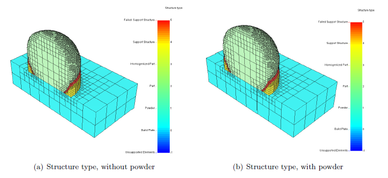 Looking at the above temperature it is apparent that including the powder makes a large difference in the temperature history of the part. The simulations with the powder are warmer than those without powder, which uses convection to approximate losses due to powder effects. This may have a significant impact upon the subsequent mechanical simulation results. First look at the support structure failure.