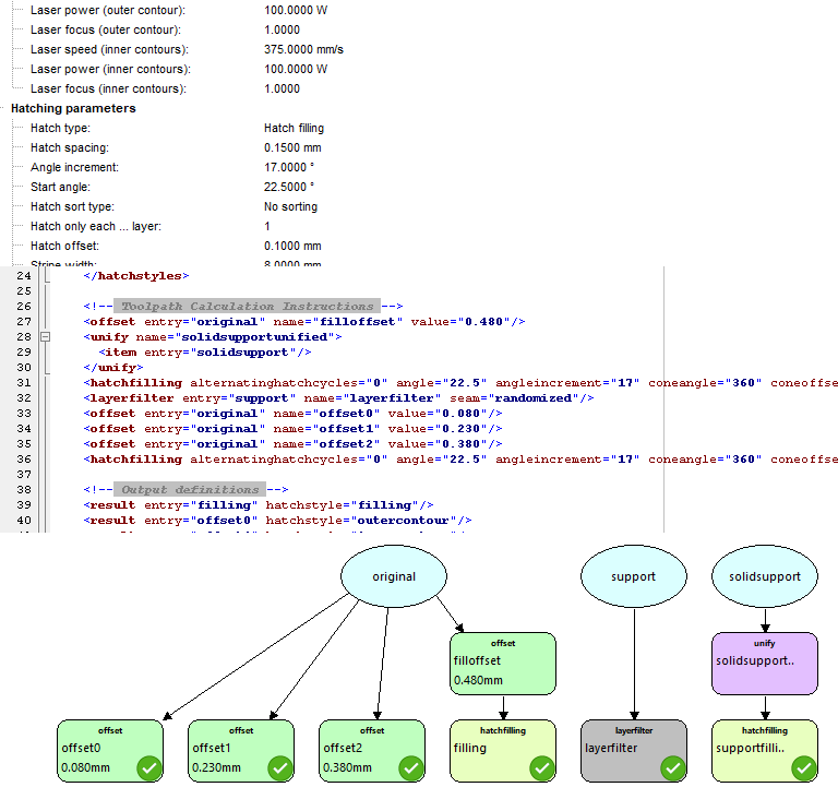To define build strategies, meaning which algorithms to use, what values their parameters have, and how they are chained together to generate the toolpaths, Netfabb's native support for powderbed-style machines uses XML. This XML definition is exposed in three variants: