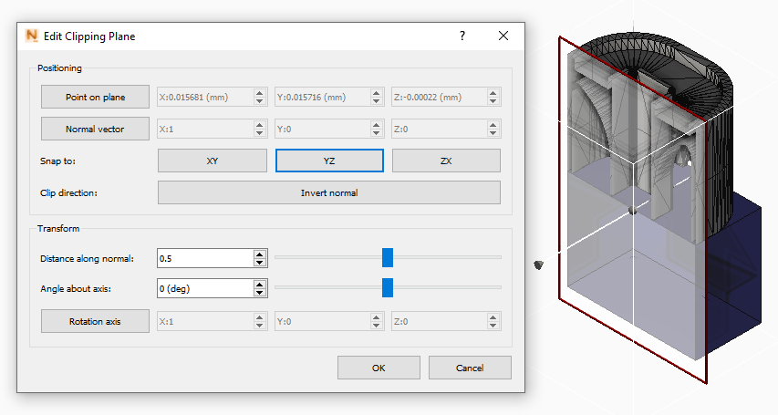 - In the Transform area, use the slider for Distance along normal to move the plane through the part; use the slider for Angle about axis to tilt the plane.