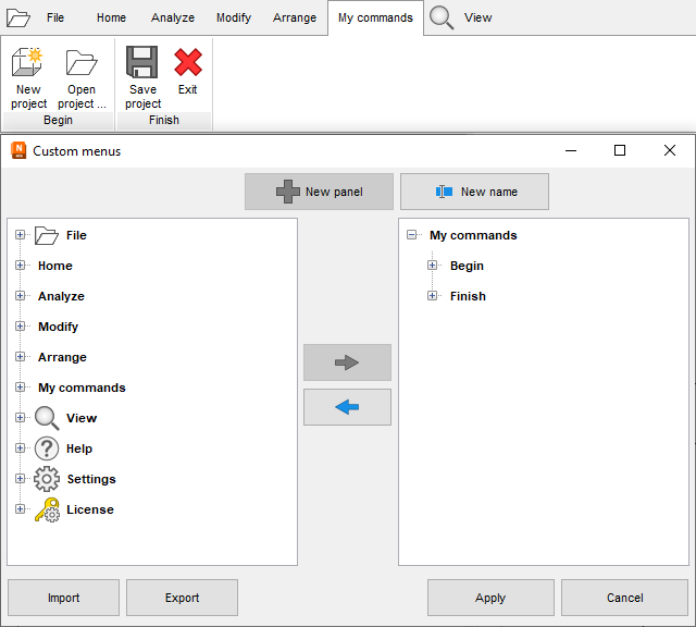 Custom menu structure assembled from existing commands. Use drag&drop to reorder items. |