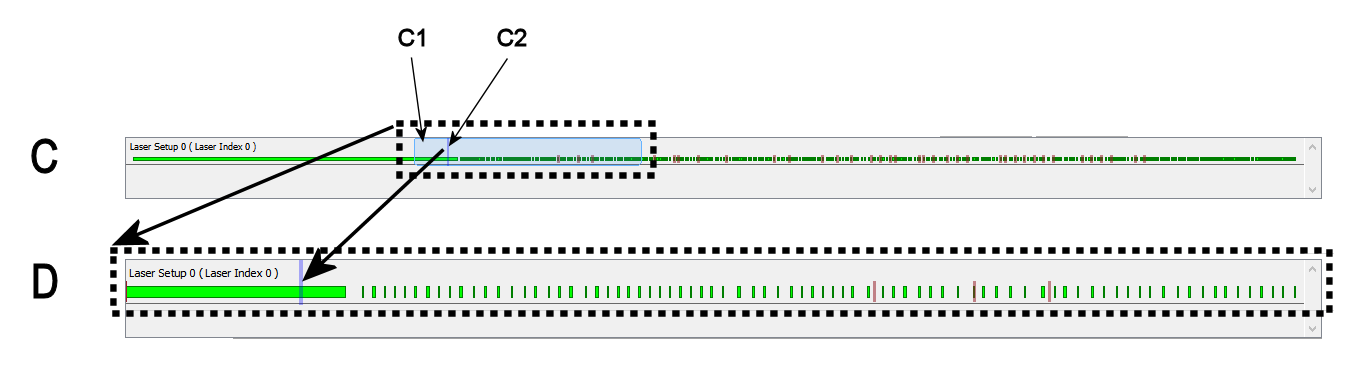 The upper area C displays an overview of the complete timeline for all the lasers.