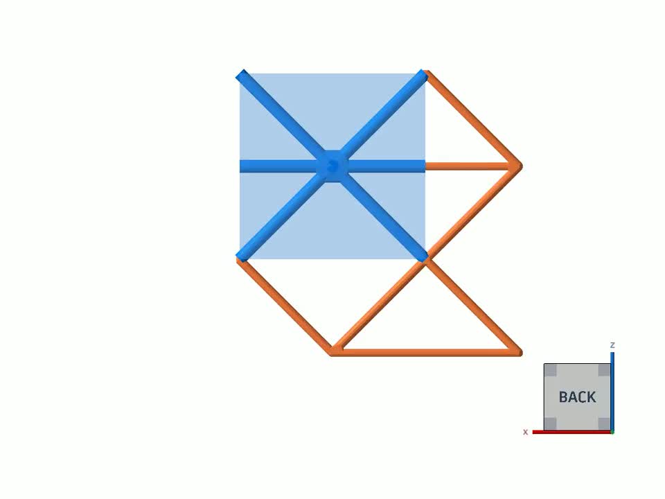 The E unit cell topology is similar to Grid, except that the 2 vertical bars are omitted and instead it has 4 additional bars, one each from the volume center along the XZ plane to the edge centers. Offset, this forms structures resembling "stacks of folding chairs".