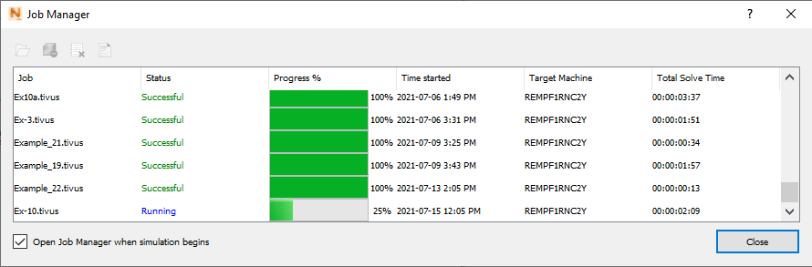 The Job Manager window opens when a Part Scale Powder Bed or DED simulation begins, unless you have deselected the check box in the lower left corner, as shown below. When the simulation ends, results are automatically loaded into Local Simulation.