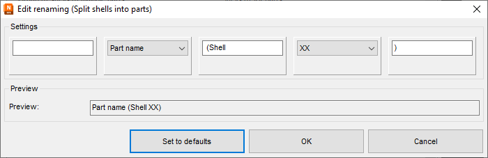 The part renaming specifies the name applied to parts after they are modified, or more accurately, to the parts generated by those modifying actions. The name of the original is always part of the new name. To change renaming settings, double-click on a function in the list, or click the button ..." which appears to the right of the function after you click on it once. A dialog appears to change the automatic renaming. You can insert what is added before or after the part name in the text fields left and right of part name. Below, you can see a preview of how your parts are named. "Part name" always refers to the name of the original part. With the button Set to defaults at the bottom of the dialog, you restore the default naming for that particular function. The default setting for repaired parts, for example, is that (repaired) is added to the original part name.