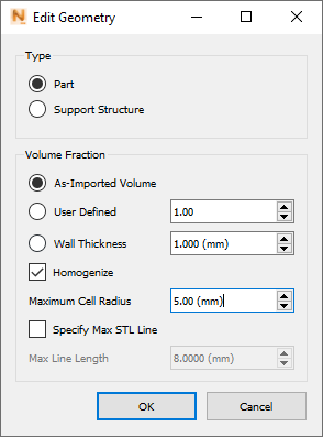 Note that Volume Fraction is set to 1.00 and Homogenize is not selected as this part is fully dense. We will use different settings in this dialog as we import Support Structures and a Lattice component from the Example_22 folder.