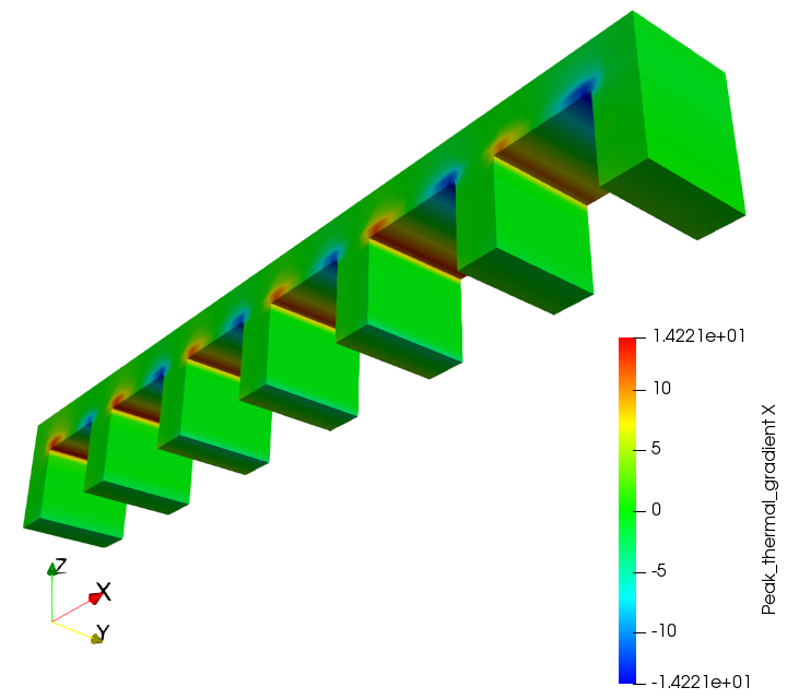 Interlayer peak thermal gradient data along X in Kmm⁻¹, captured with *ODTP during part-scale simulation, visualized with ParaView. Due to the directional visualization, heat flowing towards the vertical studs either side of the plateaus produces a gradient pattern that alternates between positive and negative values.
