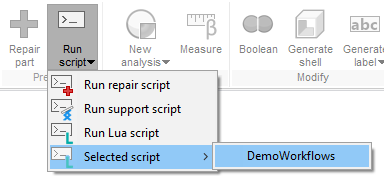 Noteworthy examples are the scripts DemoApplication and DemoWorkflows. Both are full applications written in Lua and run within Netfabb. They implement a selection from the example scripts and make them available via GUI to demonstrate not only the use of such scripts but also how to implement a GUI to collate such functions. They are two of the default scripts loaded in the library.
