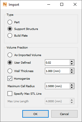 After you select the object Type and check the Homogenize box, you can choose how to define the Volume Fraction of the part or support: