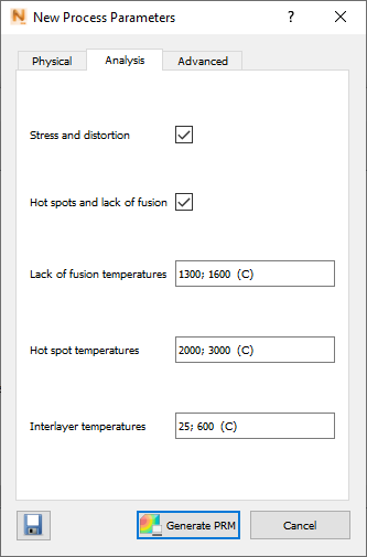 By means of the two check boxes at the top, you can specify the type of PRM file to create: for Stress and distortion analysis, Hot spots and lack of fusion analysis, or both. The three temperature fields at the bottom of this dialog are active only if you select Hot Spots and lack of fusion. The temperatures that should be set for this type of PRM generation are as follows: