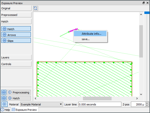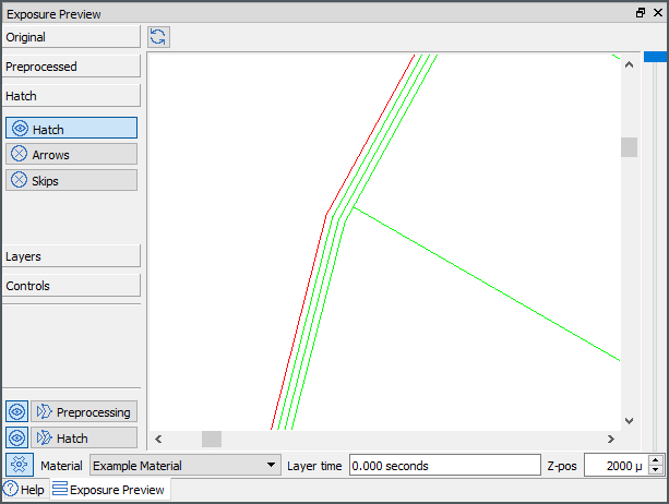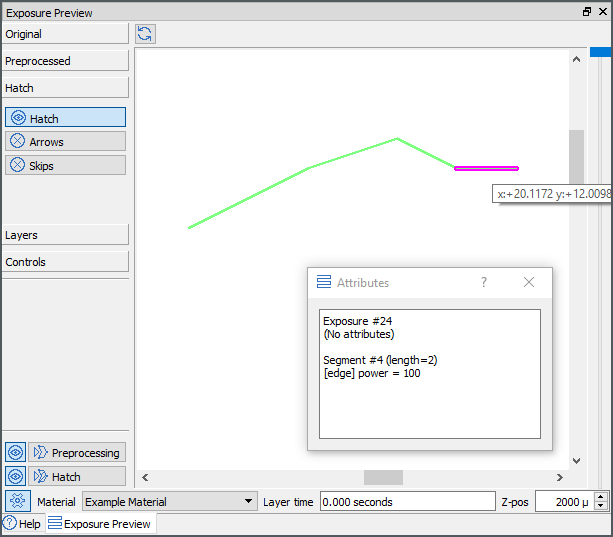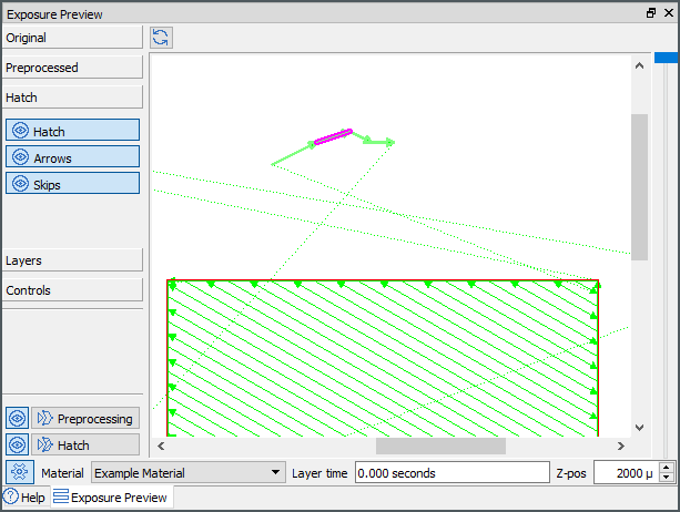 While printing a layer, the additive printing machine will follow the toolpath from a start to an end point. As soon as the layer contains more than one area, the machine has to stop operation, jump to a new position and start operating again. This operation is called a skip. The exposure preview widget is able to show all skips, if desired. The following picture shows skips as dotted lines and a look at the open path below shows, that a skip is needed to reach the beginning of the segment and again to get away from it.
