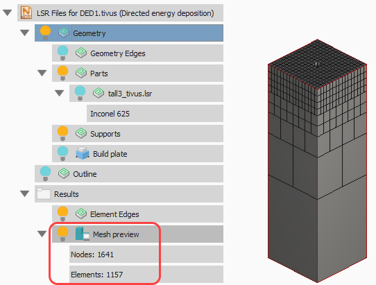 In the Browser, below the Mesh Preview icon, mesh metrics are shown for the number of Nodes and Elements, which can be used to estimate complexity of a simulation using the current mesh settings. Mesh preview for powder bed fusion models also shows Layer-Nodes (number of nodes X number of simulated layer groups).