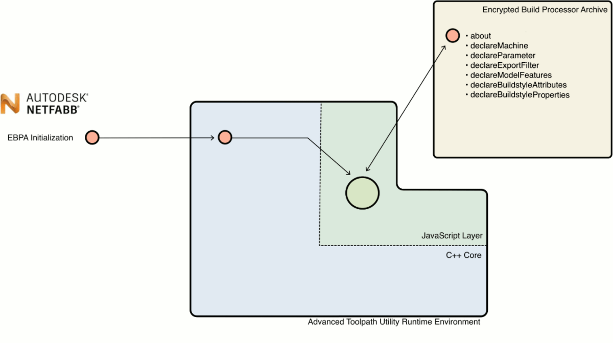 With the ability to change layer contour data and to create toolpaths and machine buildfiles, the ATU build processor can be used for various tasks. To ensure a consistent behavior across different host applications (eg. Autodesk® Netfabb®), a strict integration workflow for host applications was set up to guarantee identical processing results. It is important for every ATU developer to be aware of this workflow, because it influences operation order and data management of ATU JavaScript projects: