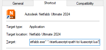 - Edit the shortcut and add "/startluascript=path\to\luascript.lua" to what is already specified in the Target: field, adjusted for your Lua script file's respective path and name.