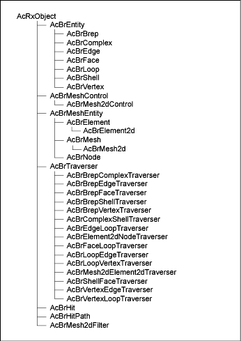 Share Email Facebook Twitter LinkedIn Class Hierarchy The AcBr class hierarchy is a subset of the ObjectARX ® class hierarchy, and defines the following classes: Note that AcBr objects are not derived from AcDbObject, and therefore cannot be registered with the AutoCAD database. Parent topic: Using the Boundary Representation Library