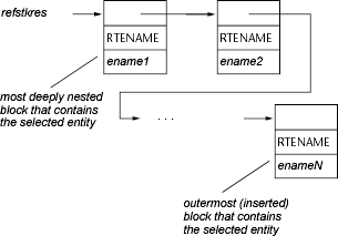 The function acedNEntSelP() provides an argument for context data, refstkres. (This is another feature not provided by acedEntSel().) The refstkres argument is a pointer to a linked list of result buffers that contains the names of the entity's container blocks. The list is ordered from lowest to highest. In other words, the first name in the list is the name of the block containing the selected entity, and the last name in the list is the name of the block that was directly inserted into the drawing. The following figure shows the format of this list.