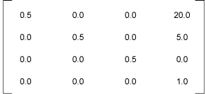 Applying this matrix scales the entities by one-half (which moves them toward the origin) and translates their location by (20.0,5.0).