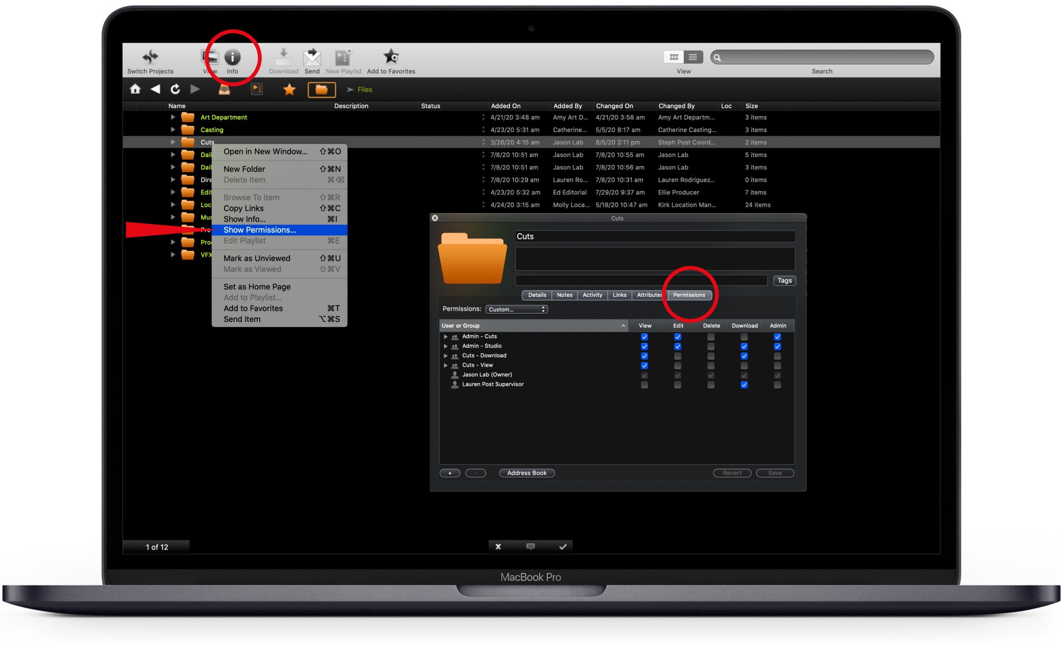 To view and edit permissions on a folder, navigate to the Files section and select a folder. Click the Info button in the top menu bar, and select the Permissions tab.