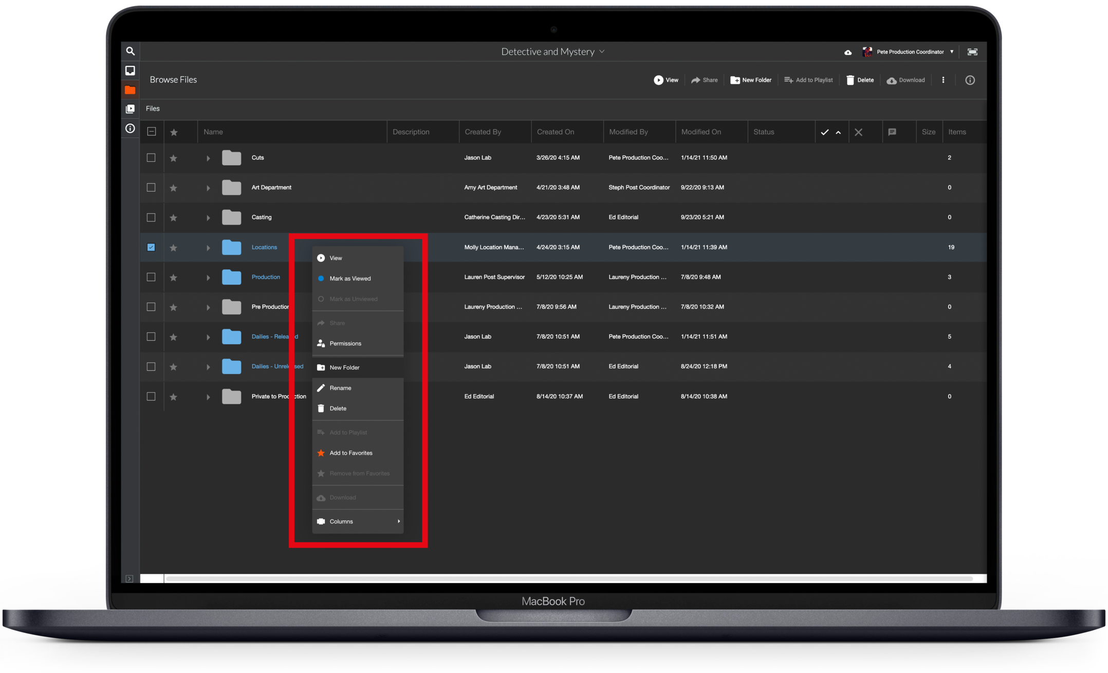 Users can be granted various types of permissions to one or more folders within the project. For a breakdown of permission types, please see the Adjusting Folder Permissions page. The people who post the media can control access to these folders, granting you access to view, download, or edit the content. The folders you see are likely different than the folders someone in another department sees.