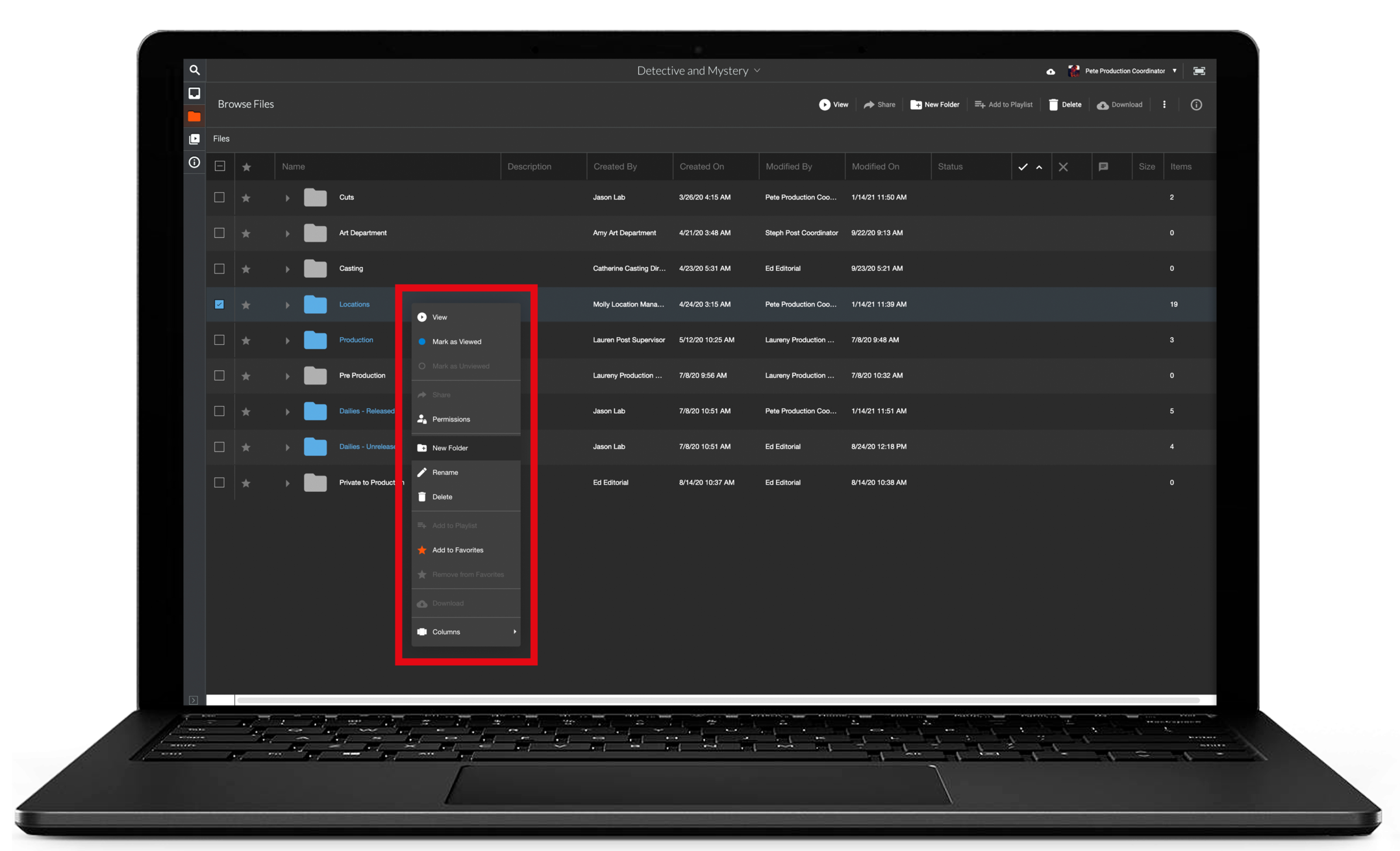 Users can be granted various types of permissions to one or more folders within the project. For a breakdown of permission types, please see the Adjusting Folder Permissions page. The people who post the media can control access to these folders, granting you access to view, download, or edit the content. The folders you see are likely different than the folders someone in another department sees.