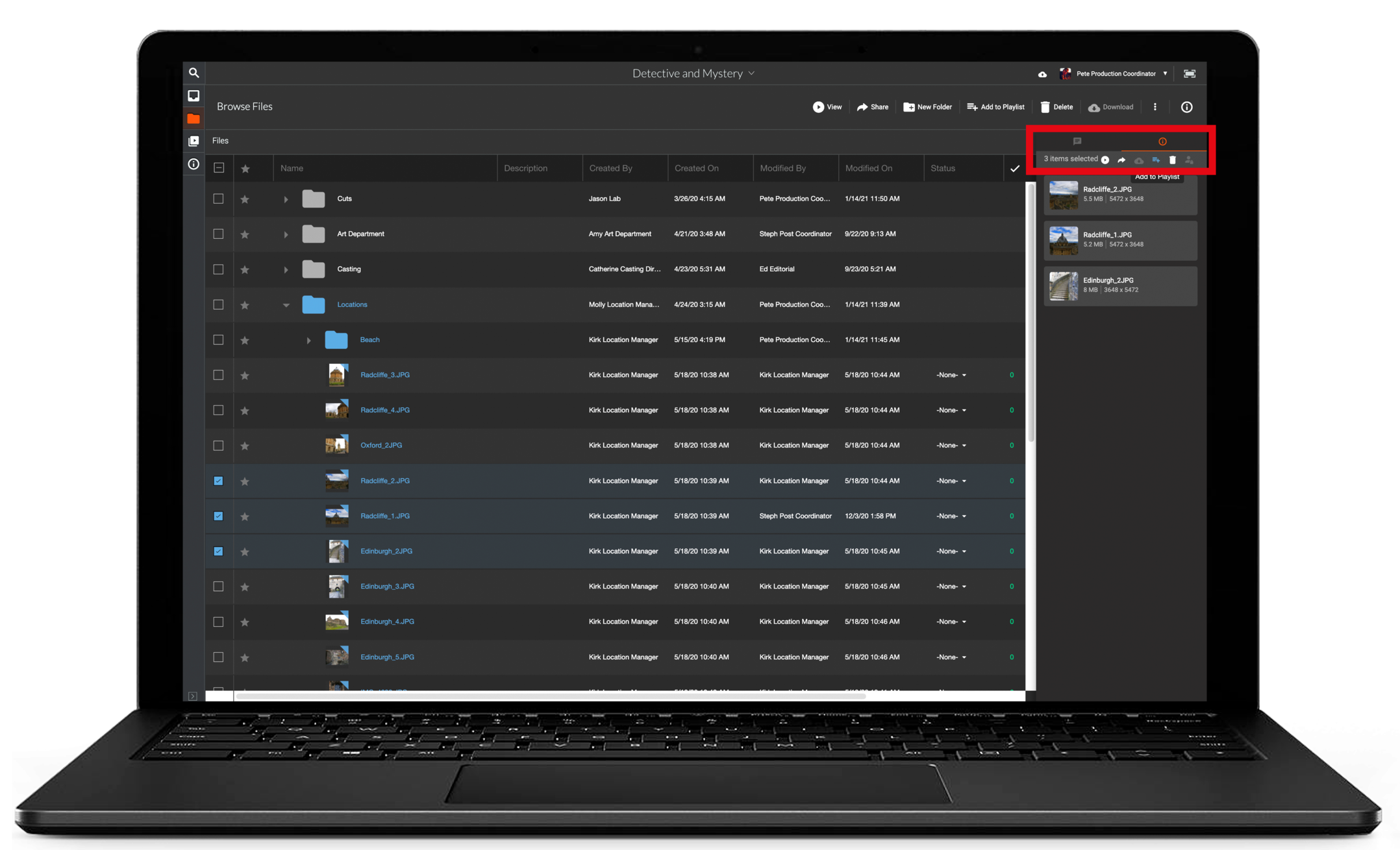 You will notice the info panel changes to provide you with some truncated information for each file, as well as a set of actions: View, share, Add to Playlist, etc.