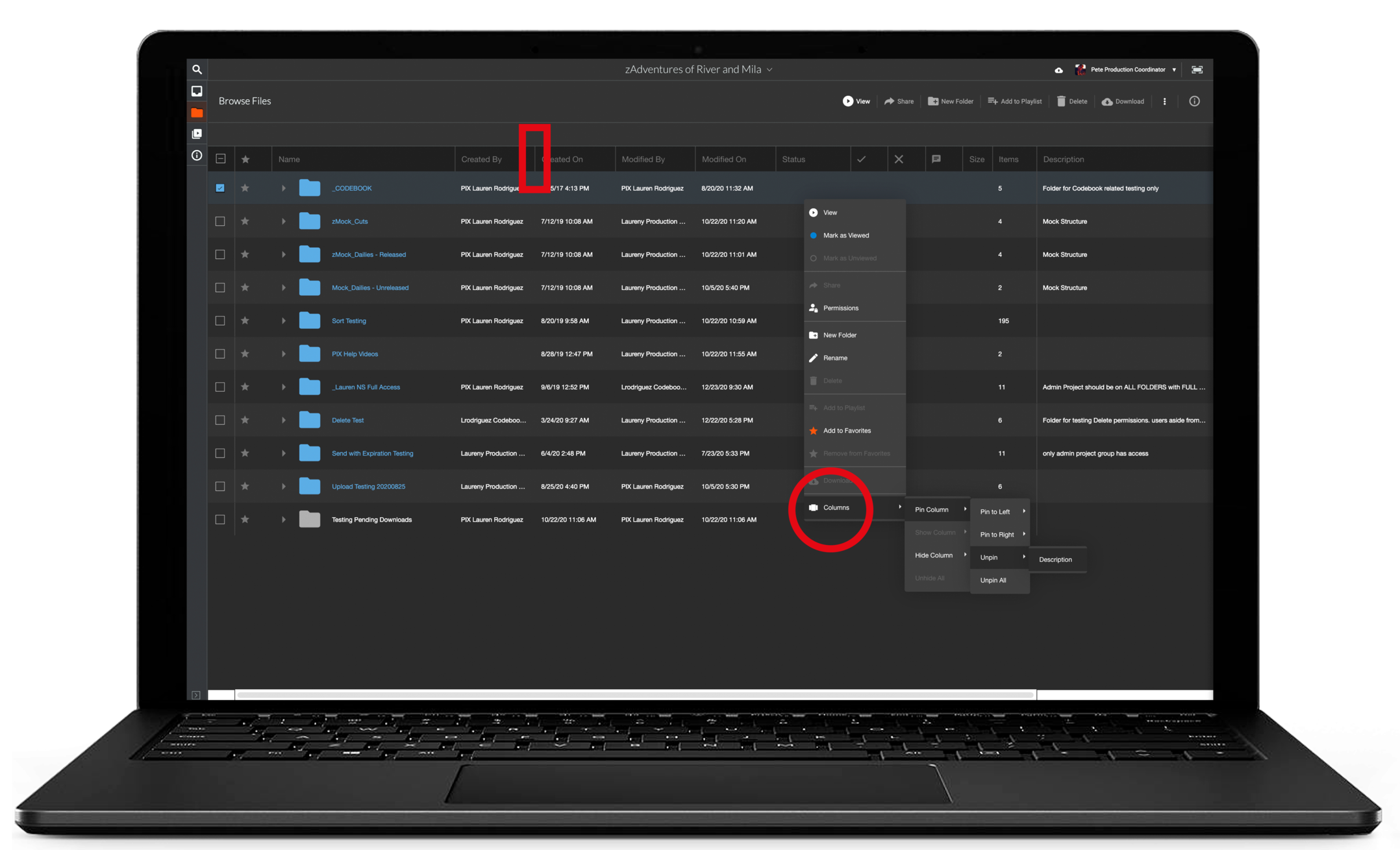 Right-click in the folder area and choose Columns. Here, you can Pin or hide columns to suit your workflow.