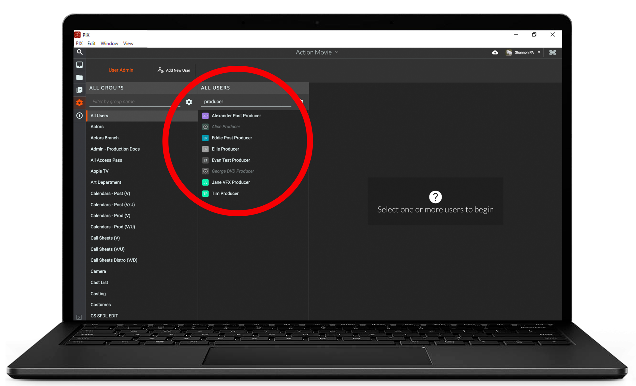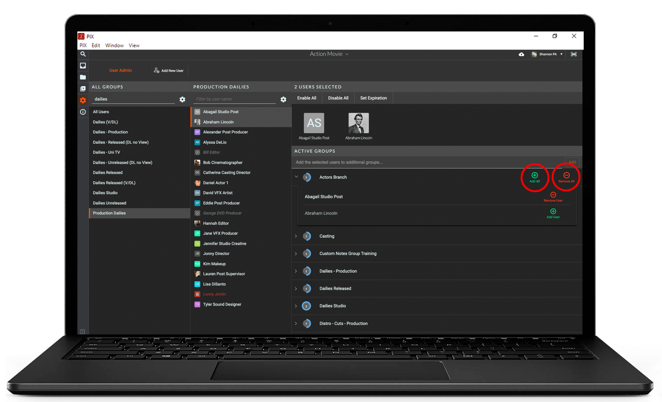 Manage multiple users using the Shift key to multi-select. The selected users' information will appear on the right with their list of groups below.