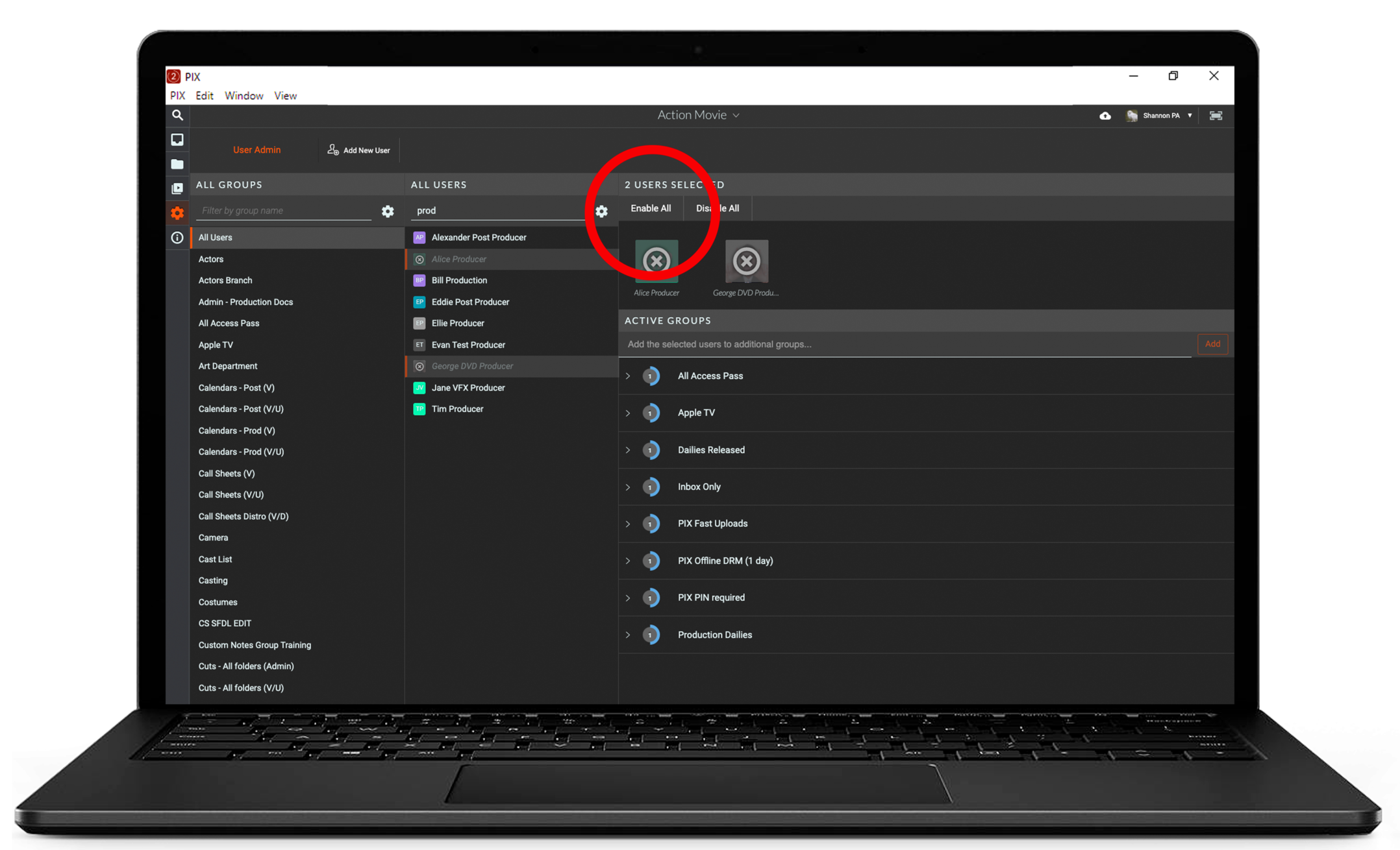 To enable multiple disabled users at once hold the shift button and select the users then click the Enable All button at the top of the user information section.